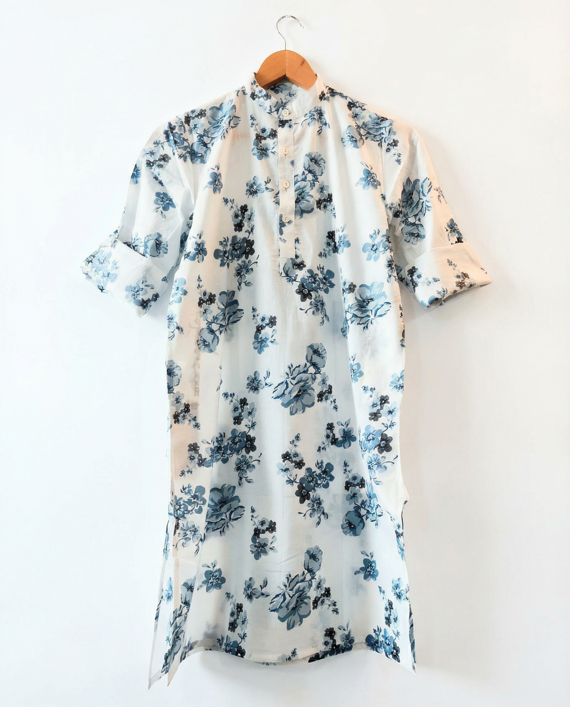 Set on a gentle off-white base, indigo blue floral motifs flow across the fabric like hand-painted memories. Inspired by Indian gardens and traditional textile art, this kurta feels refined yet playful—perfect for children who enjoy comfort wrapped in quiet beauty.