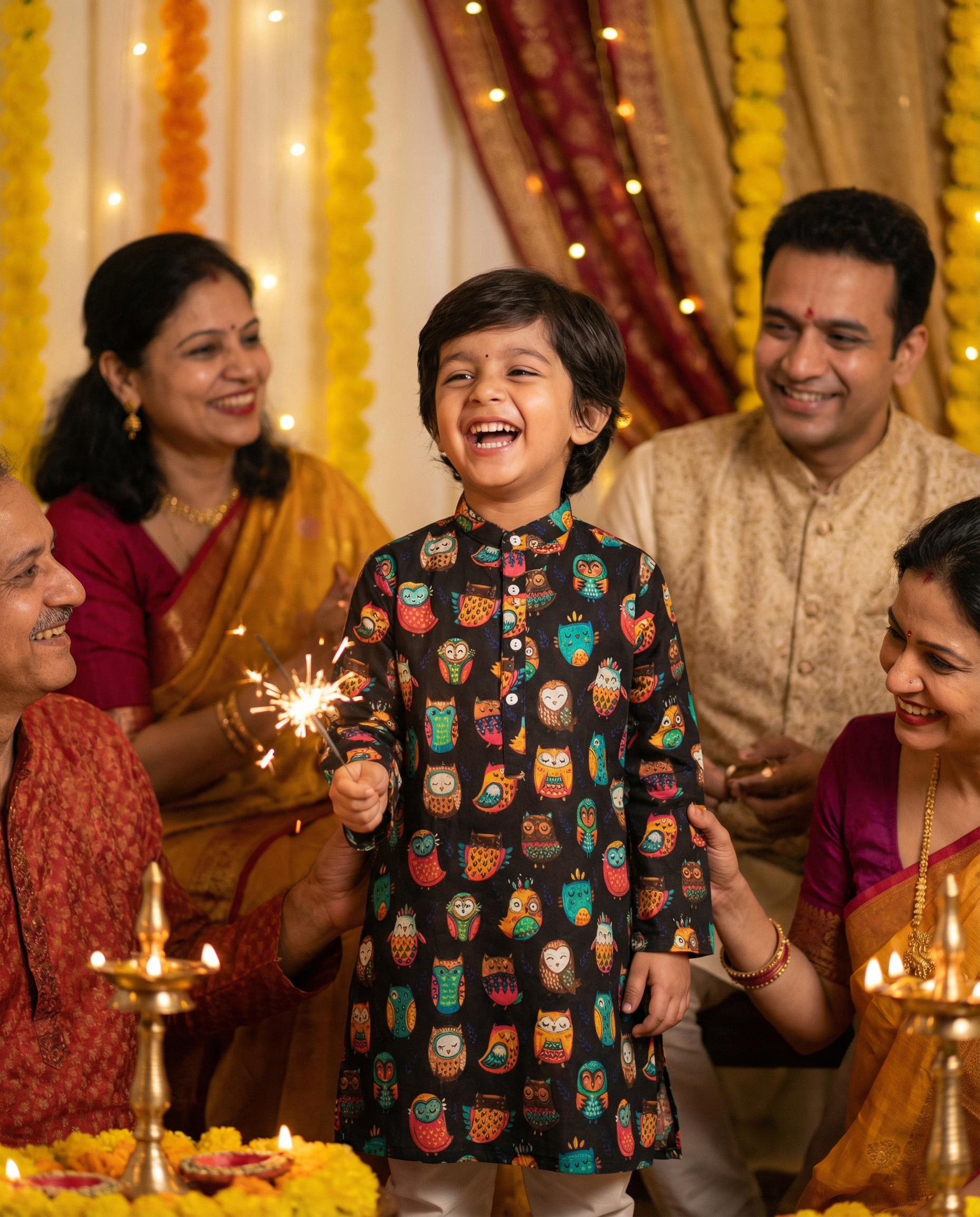 Bright, curious, and full of personality — the अBIR Udaan Owls Kurta for Boys is designed for little minds that never stop wondering.