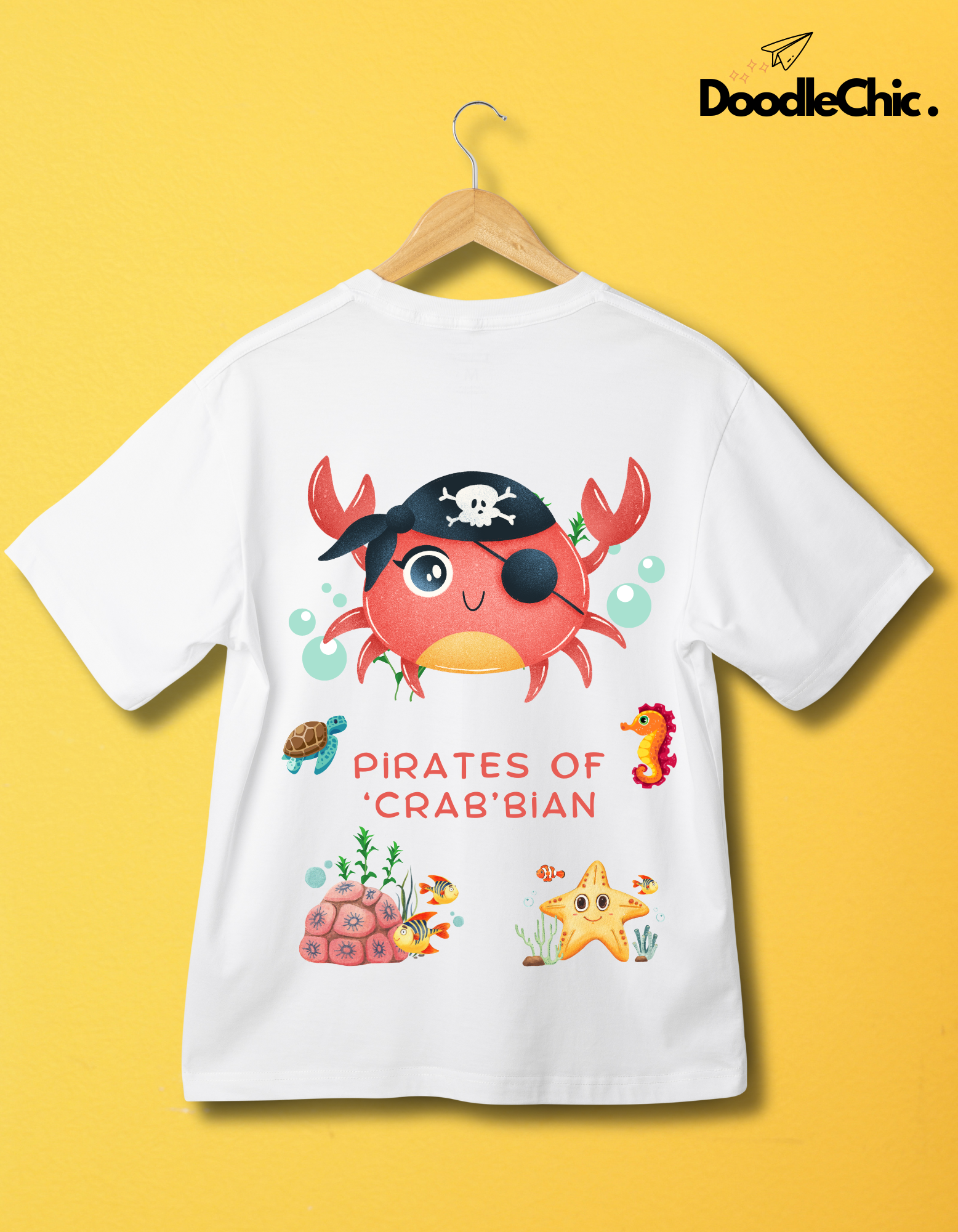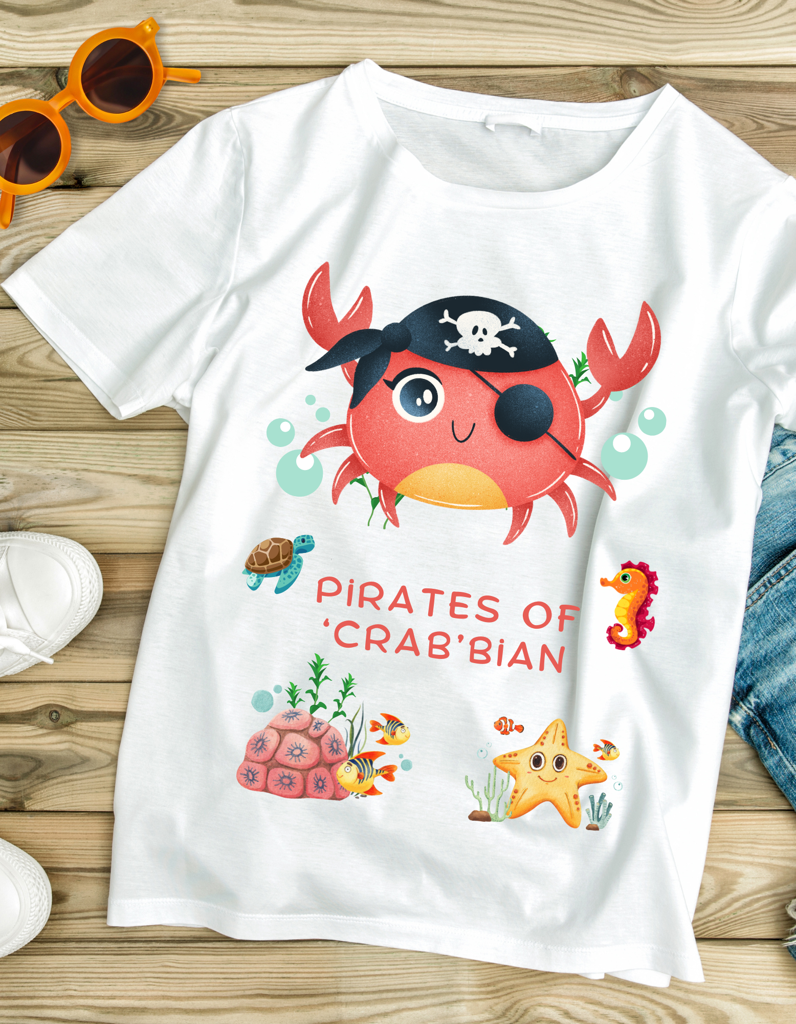 Our dedication to premium quality ensures a soft touch against delicate skin, making this tee a favorite for young swashbucklers and environmentally-conscious parents alike. The 'Pirate Crab' theme adds a splash of whimsy, featuring a daring crustacean captain ready to embark on treasure hunts and ocean escapades.