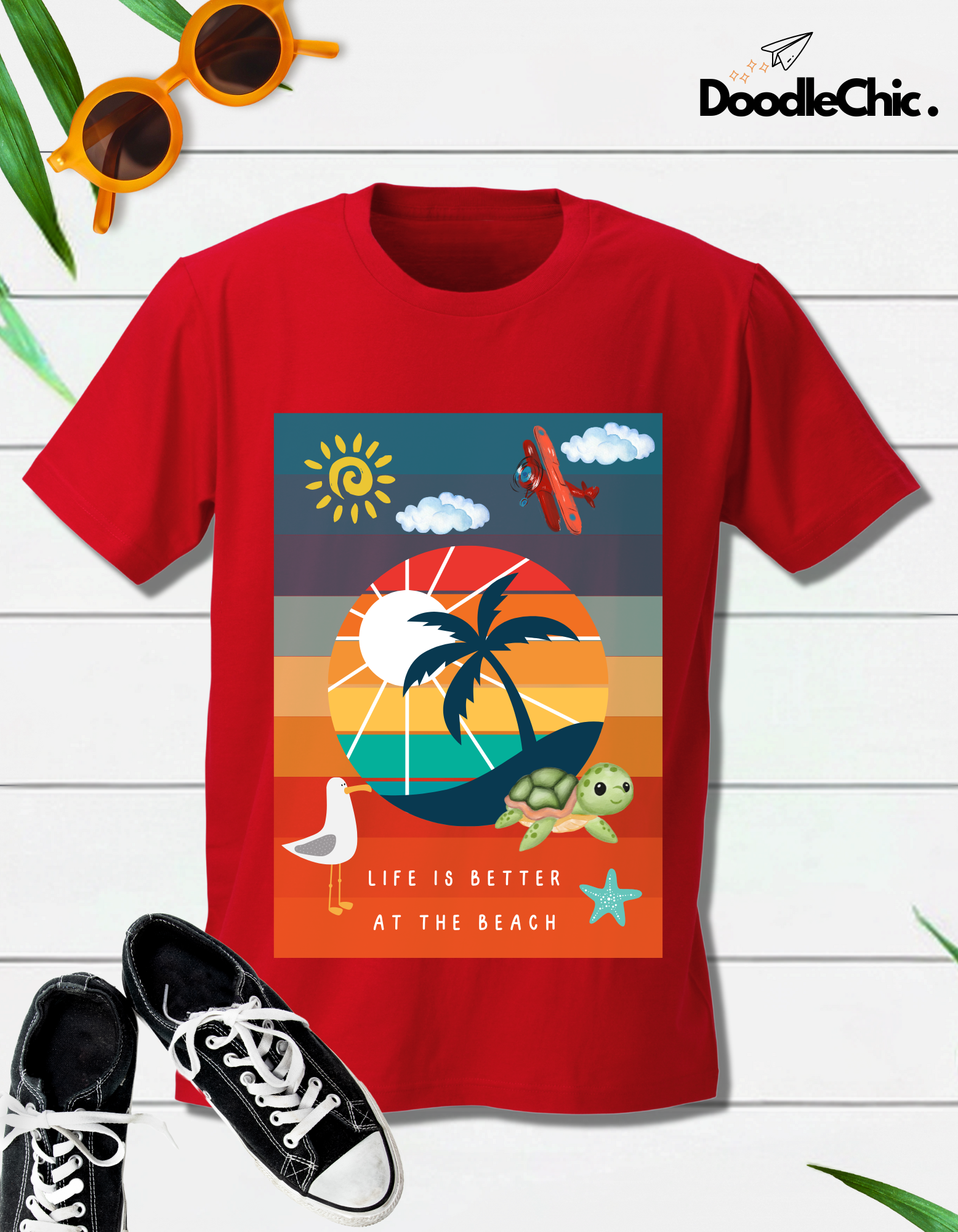 The t-shirt features a relaxed fit for all-day comfort and freedom of movement, making it ideal for playtime at the beach or casual outings. The 'Life at Beach' theme is beautifully printed on the front, showcasing a fun and colorful beach scene with palm trees, waves, and playful sea creatures, adding a touch of summer fun to any outfit.